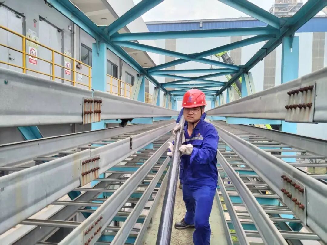 施工过程中,党员骨干间隔一米排成长龙,采取接力传送的方式敷设电缆。伴随着整齐划一的“一二、一二”号子声,大家手拉肩扛、躬身发力,一步步将电缆向前推进。汗水很快浸透了工装,但没有人放慢脚步。在电缆转弯半径严重受限、局部管廊转角仅0.8米的极端工况下,全体党员迎难而上、科学协作。“前面加速拉进,转角注意放缓!”“注意防护,安全第一!”现场指令清晰、节奏有序,配合默契,胸前的党徽在阳光下格外闪耀。