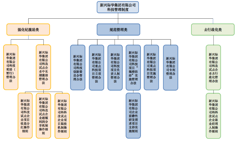 1.《新兴际华集团有限公司科技管理制度》:集团科技创新顶层设计,全面构建结构完整、功能完备、体系健全的科技创新基础性制度框架。